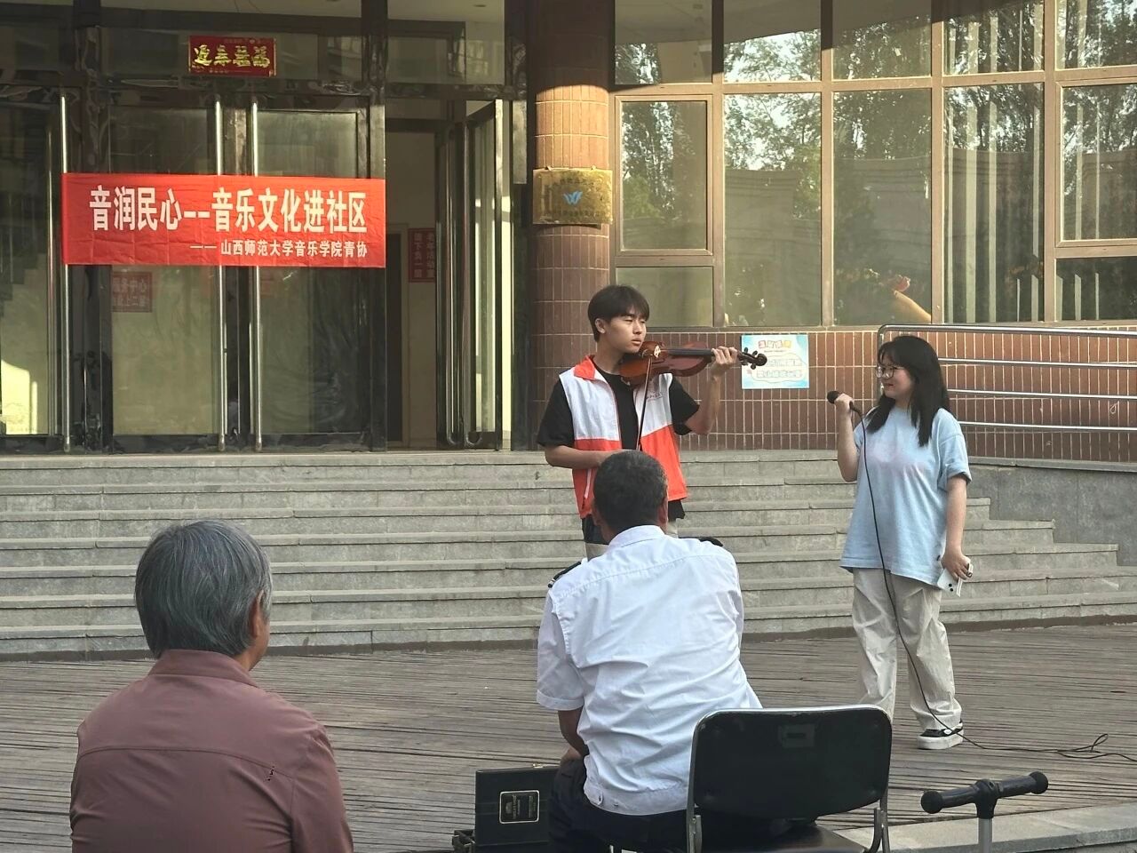 活动筹备阶段,青协成员与2402班同学精心布置现场,吸引众多居民驻足围观。活动伊始,同学们以精彩的器乐表演开场,悠扬乐声瞬间点燃现场氛围;声乐小组深情献唱《我和我的祖国》等爱国歌曲,激昂旋律引发全场共鸣。在互动环节中,同学们化身“音乐小老师”,通过趣味知识问答和技巧教学,与居民亲密互动,将活动气氛推向高潮。活动尾声,全体人员共演《友谊地久天长》,以乐会友,为此次活动画上圆满句号。