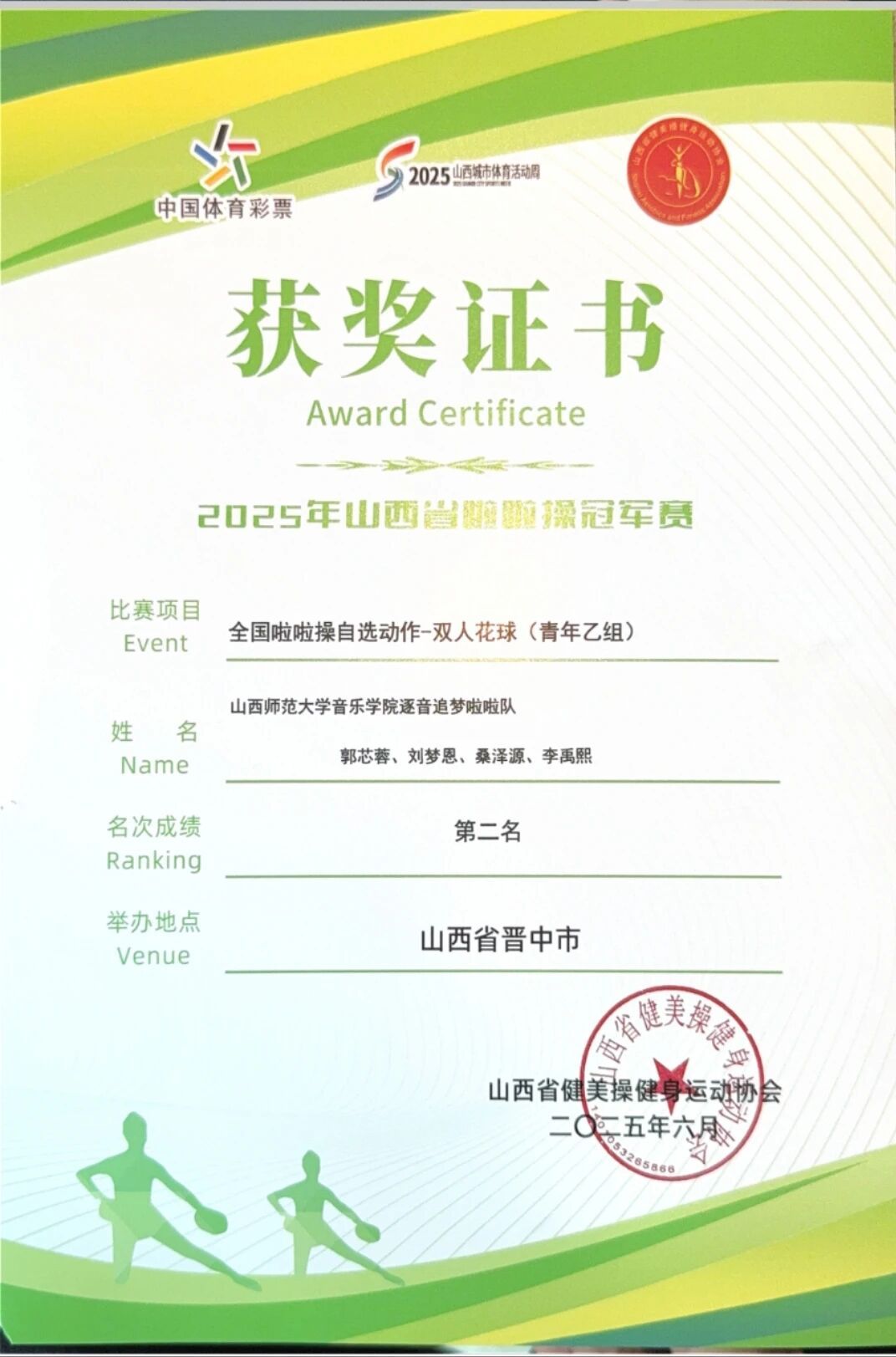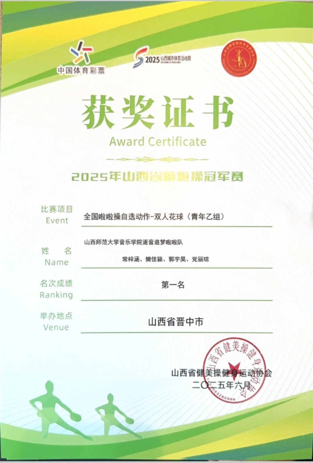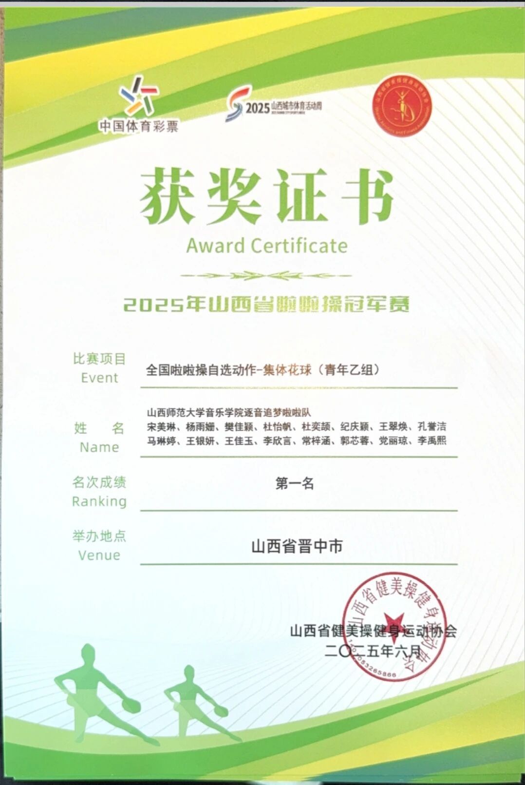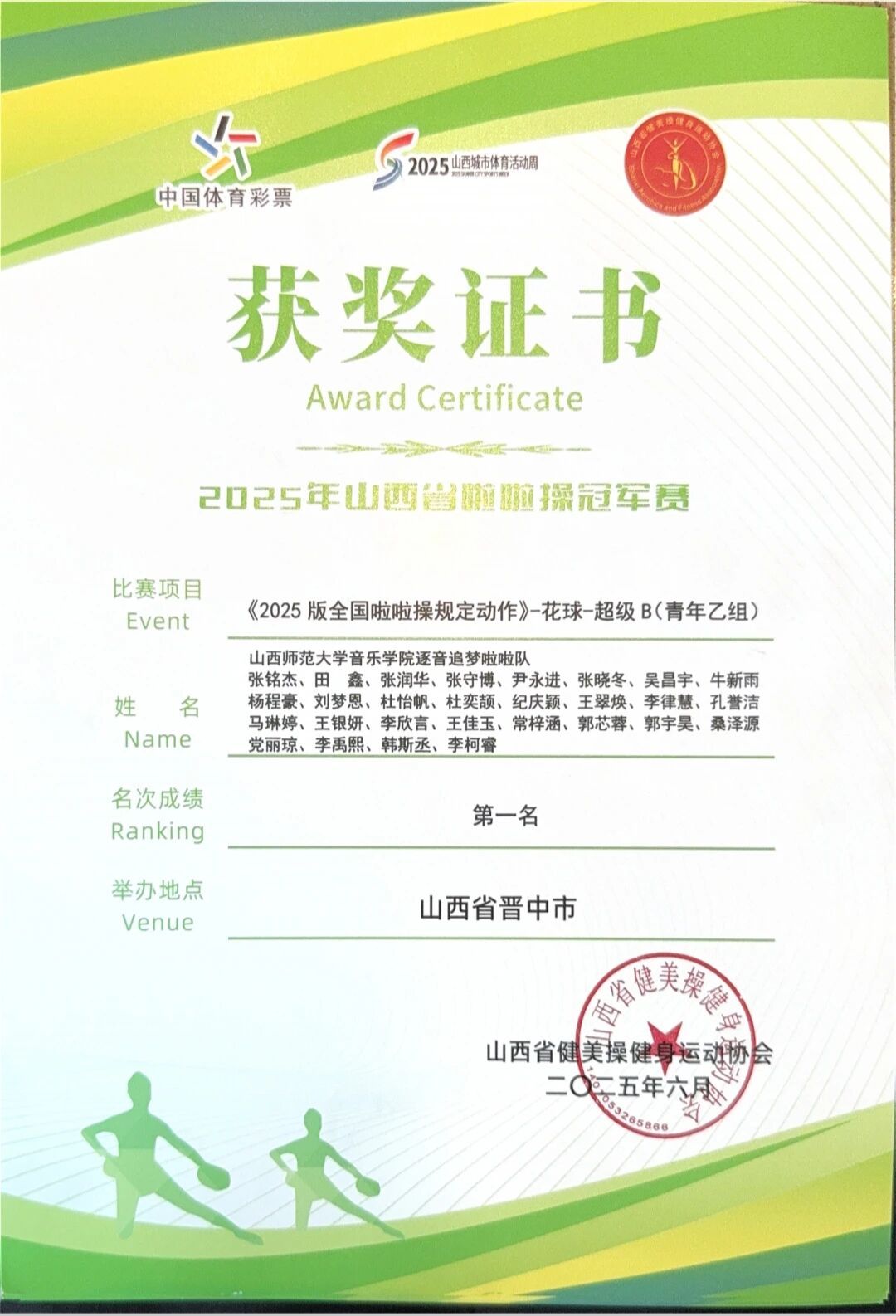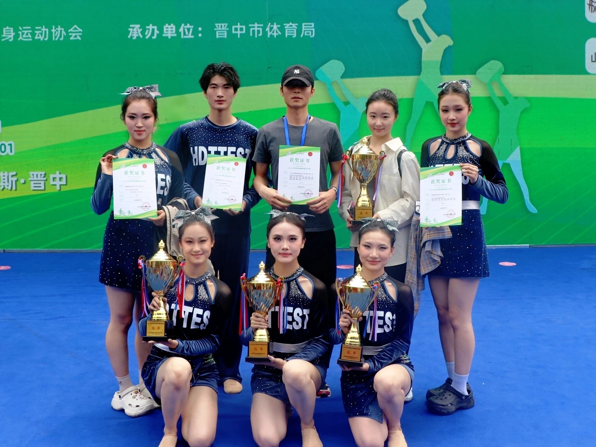 5月31日,2025年山西省啦啦操冠军赛在晋中市圆满落幕。本次赛事由山西省体操武术运动中心、山西省健美操健身运动协会联合主办,晋中市体育局倾力承办,吸引了山西省各地区、各学校的 84 支精英队伍、1600 余名怀揣梦想的运动员齐聚一堂,共同角逐啦啦操领域的至高荣誉。在这场高手如云的激烈比拼中,球友会“逐音追梦”啦啦操队凭借默契无间的配合、惊艳全场的出色表现,一举斩获“全国啦啦操自选动作 - 集体花球(青年乙组)”冠军、“全国啦啦操规定动作 - 花球 - 超级 - B(青年乙组)”冠军、以及“全国啦啦操自选动作 - 双人花球(青年乙组)”冠军与亚军殊荣,以卓越实力彰显了音院学子青春飞扬、激情澎湃的风采。