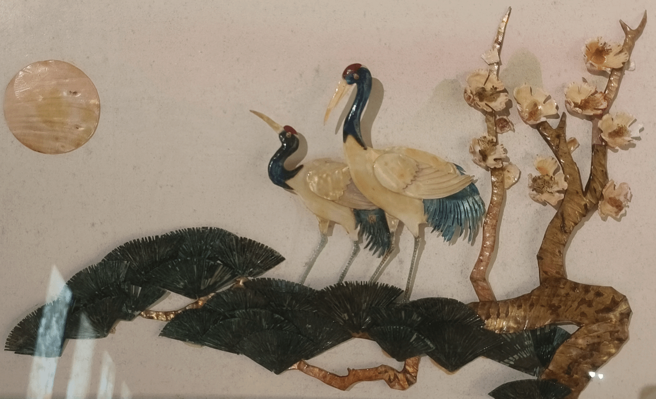 “瑞鹤呈祥”中使用的是宝石堆锦工艺。宝石堆锦是在传统堆锦工艺基础上,融入宝石元素,极大提升作品华丽感与艺术价值的独特工艺。在宝石堆锦工艺中,会选用钻石、红宝石、蓝宝石、祖母绿等珍贵宝石,以及水晶、玛瑙、碧玺等相对常见但同样绚丽的宝石。这些宝石凭借自身独特的色泽、光泽和透明度,为作品带来丝绸所无法比拟的闪耀质感和视觉冲击力,让堆锦作品从平面走向立体奢华,展现出超凡脱俗的艺术魅力。