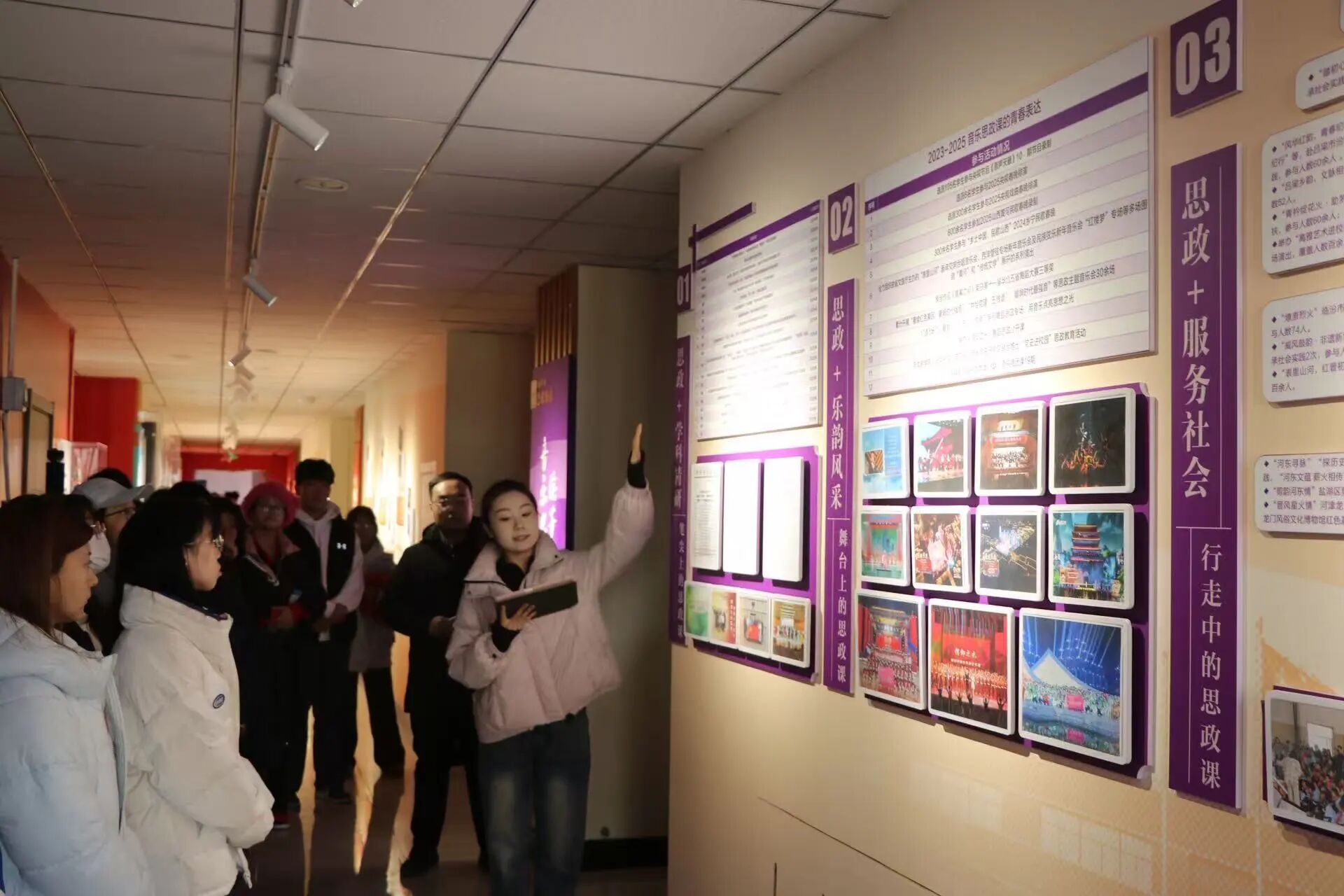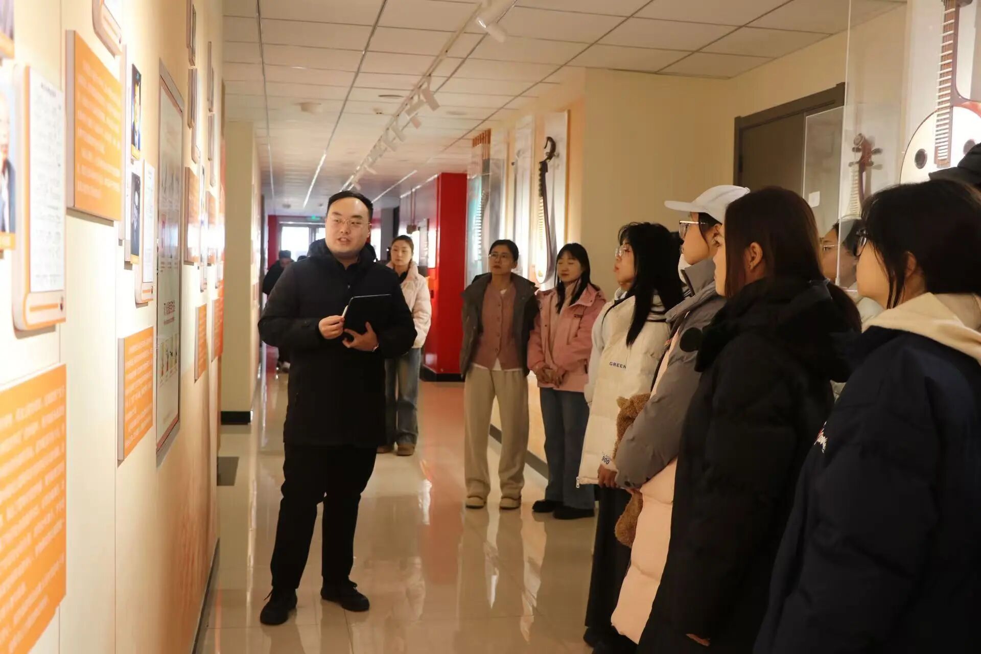 在球友会志愿者的细致讲解下,美术球友会师生依次参观各篇章展区,深入了解《义勇军进行曲》《没有共产党就没有新中国》等经典曲目背后的创作背景与精神内涵,近距离感受编钟、二胡、古筝等民族乐器及各少数民族文化的独特魅力,直观体会“以美育促德育,以艺术化人心”的育人理念。参观过程中,双方师生围绕音乐与美术的思政表达、艺术形式的跨界融合等话题展开热烈交流。