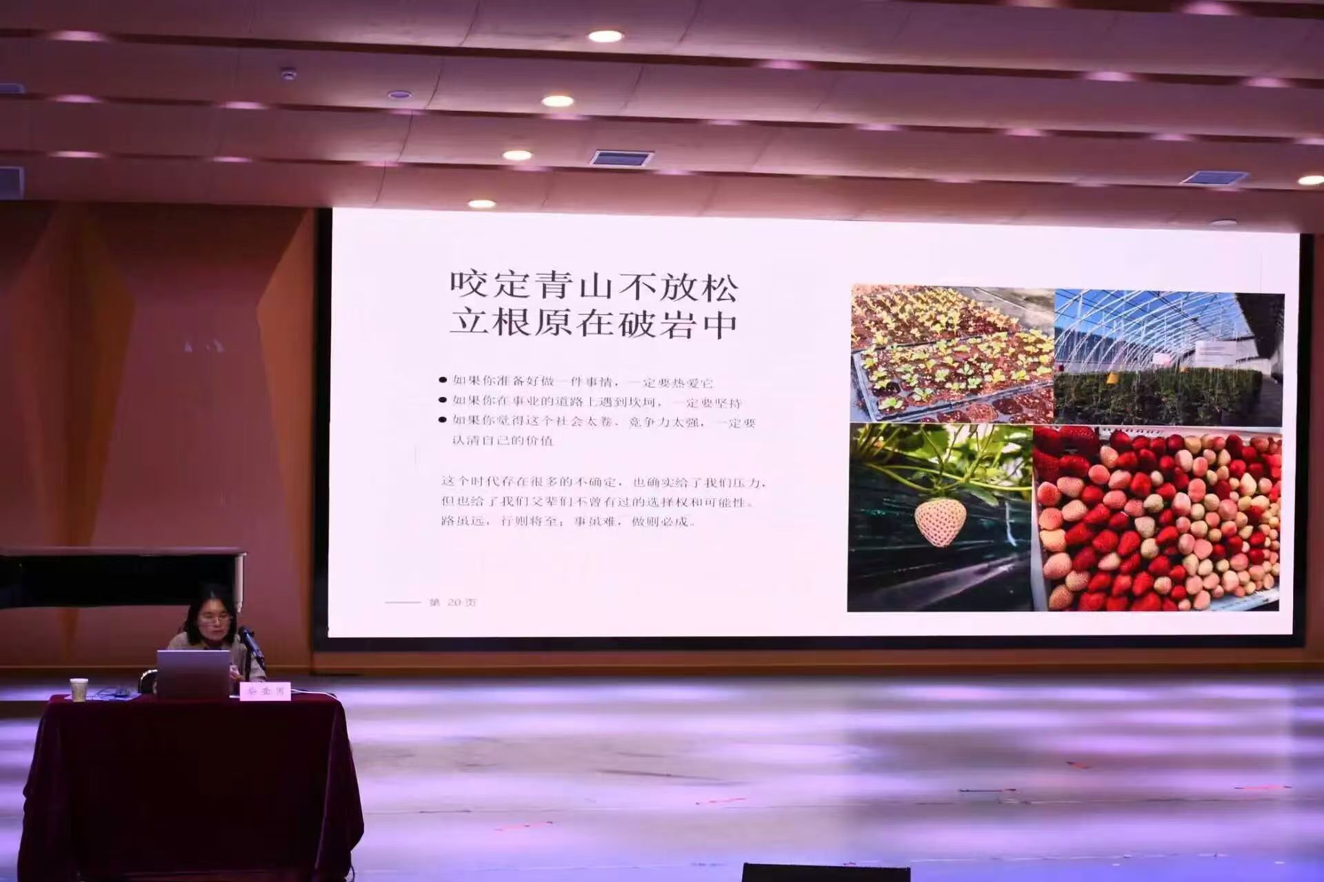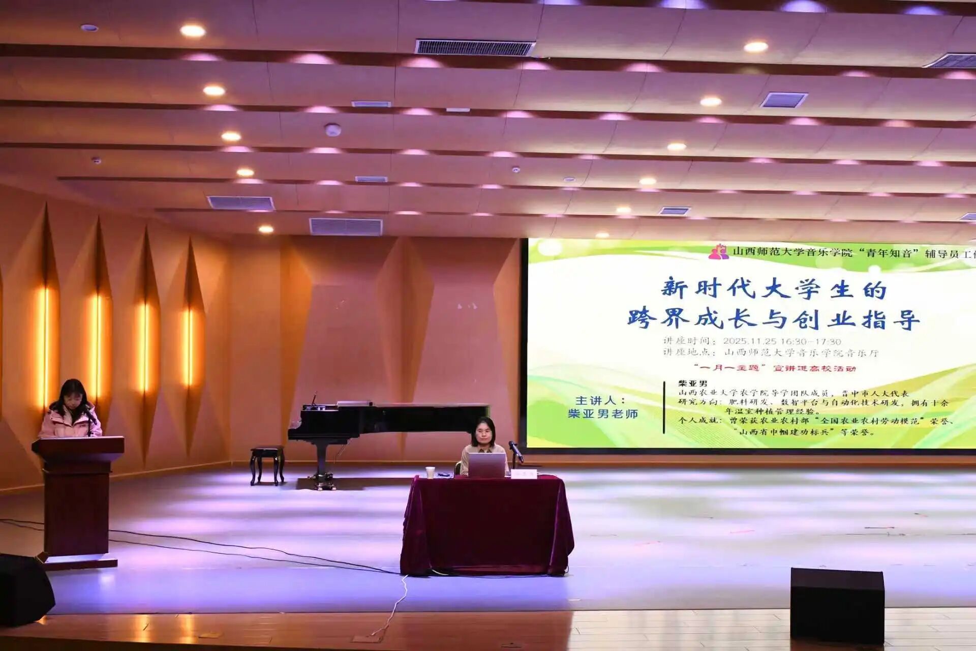 讲座中,柴亚男以“守正出奇”为主题,分享了自己在农业领域的创业故事。她结合自身十余年温室种植管理经验,讲述了从草莓种植绝收、沙漠玉米种植遇风沙等创业挫折中不断学习、复盘,最终连续两年突破山西省玉米高产记录的经历。同时,她还介绍了团队在农业+科技、农业+旅游、农业+教育等“第六产业”融合发展方面的探索。她鼓励在场师生要敢于追梦、深耕细作,在自己的领域做到极致。