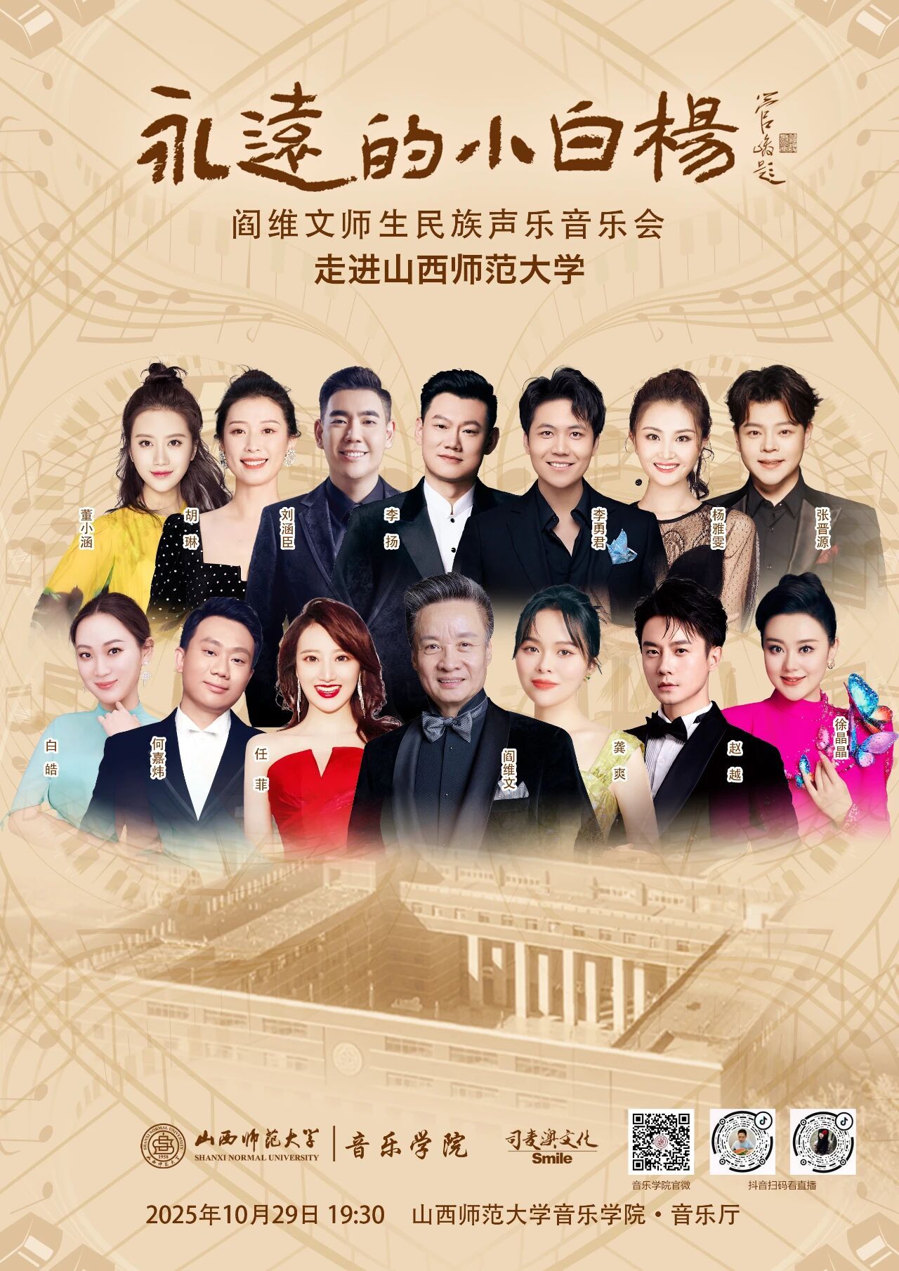 这场民族声乐视听盛宴,声乐爱好者与艺术文化追崇者皆不可错过!10月29日晚,诚邀共赴音乐之约,于“小白杨”旋律中,沉醉于民族声乐无限魅力!