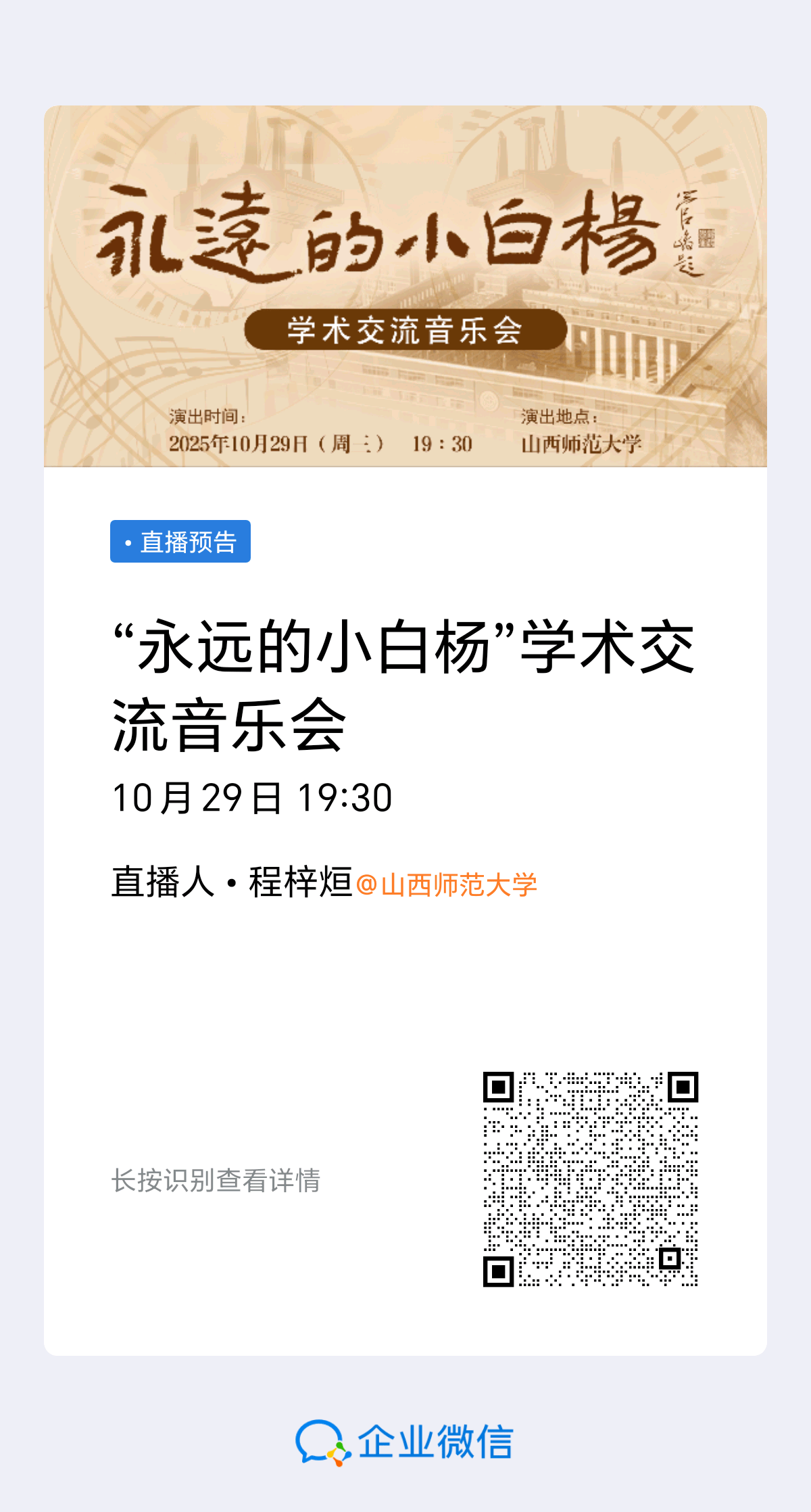 - 校内师生可通过企业微信直播观看:程梓烜@球友会,长按识别海报二维码即可进入