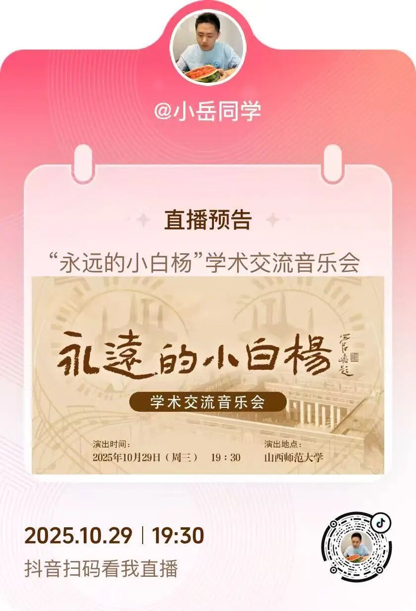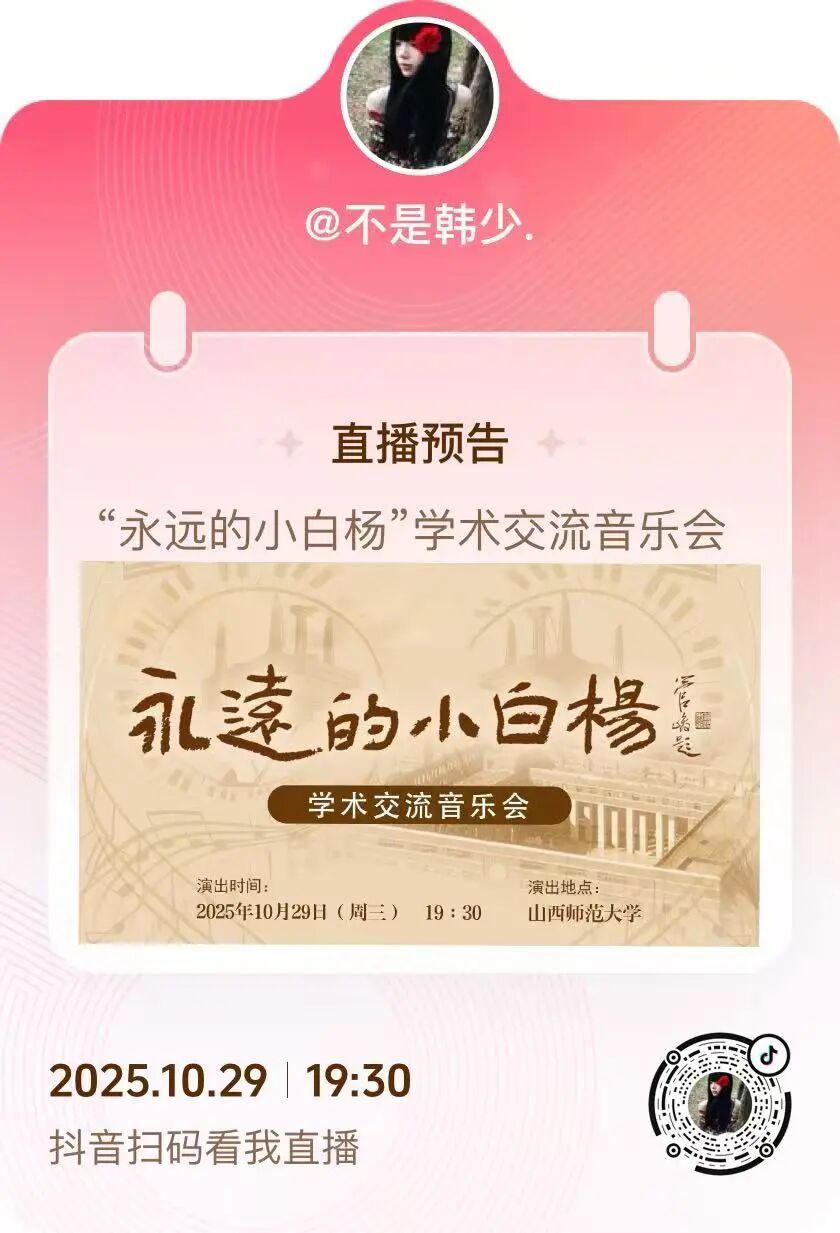 - 抖音直播:@不是韩少、@小岳同学 同步开播,扫码关注主播,10月29日19:30准时锁定精彩!